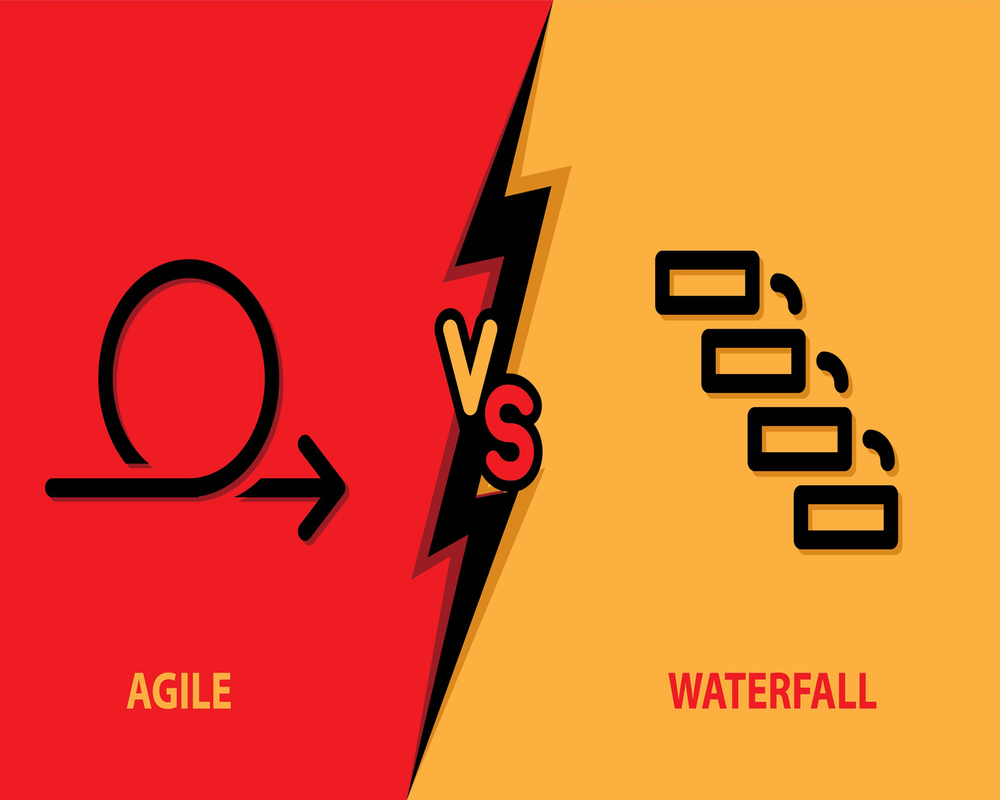 Flow diagram showing iterative software development cycle with analysis, design, build, test, and deploy stages