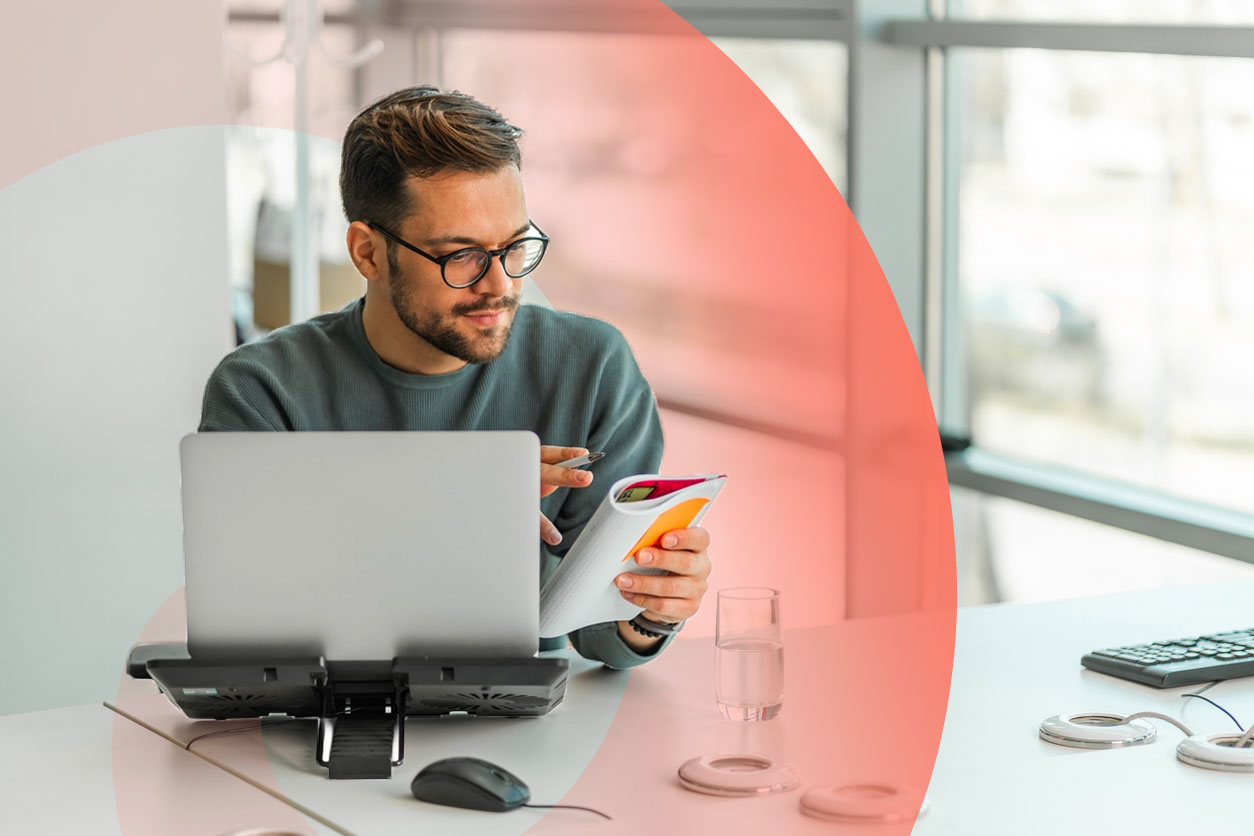 Professional working at a desk with a laptop and notebook and reviewing notes in a notebook.